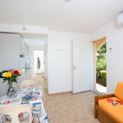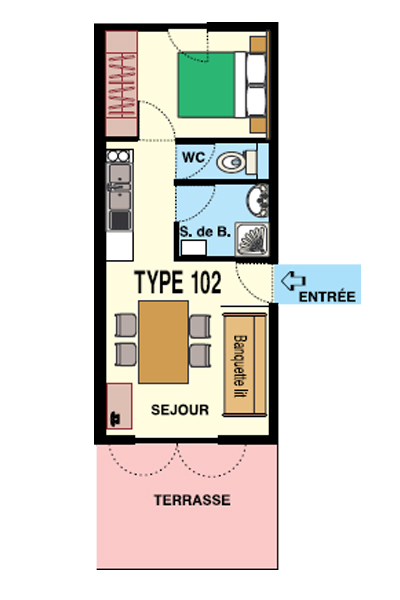 Nos appartements de type 102 sont le grand classique de la résidence pour ceux qui veulent allier confort et maîtrise budgétaire. Composé d’un séjour avec deux couchages sur un canapé gigogne, d’un coin cuisine (une cuisine toute équipée), de toilettes séparés ou d’une salle d’eau récemment rénovée pour partie, d’un lit pour deux personnes dans une chambre éloignée du séjour pour un gain de tranquillité, cette locations-de-vacances offre un bel appartement avec une surface habitable conséquente dans une résidence de vacance attractive. C’est la location idéale pour les couples âgés ou non voulant une certaine aisance en bénéficiant d’un vrai lit avec un matelas de qualité, mais également pour les jeunes couples avec des enfants mais voulant s’assurer un peu de tranquillité, tout en gardant un œil sur la pièce principale.